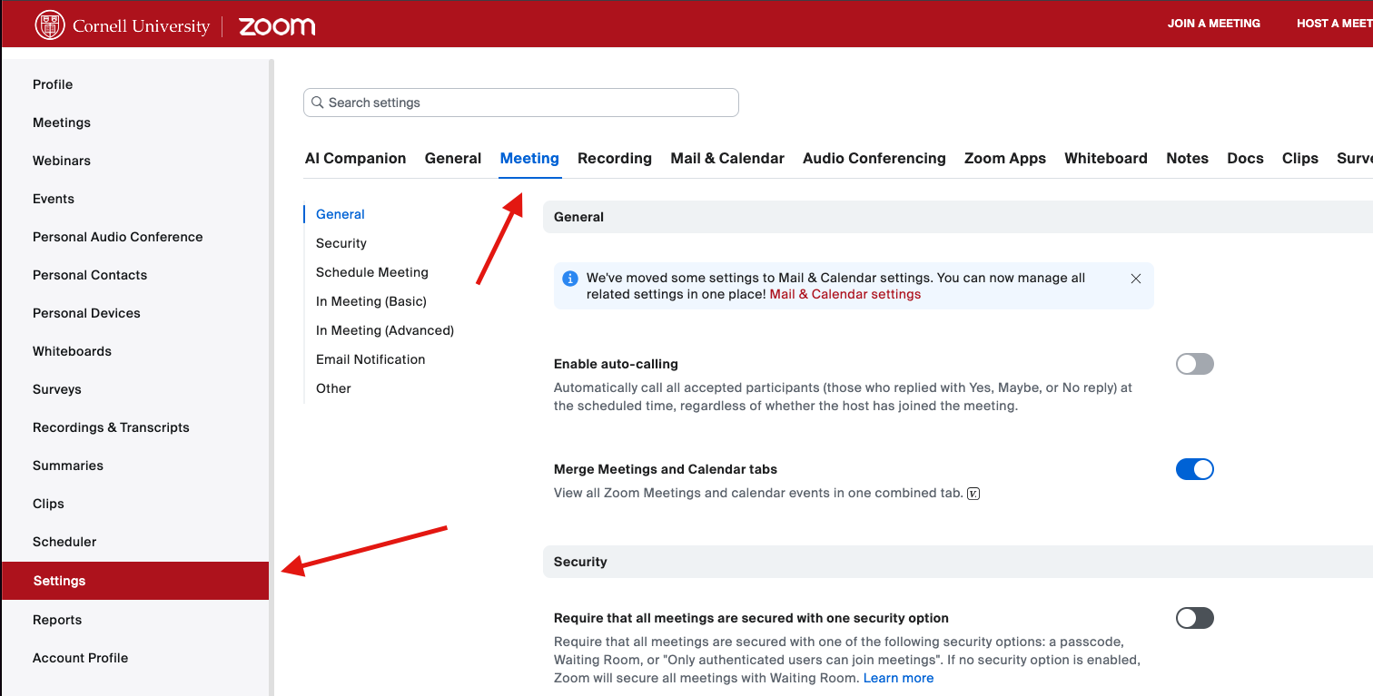 - Click on Settings from the left-hand navigational menu, and then click Meeting:
