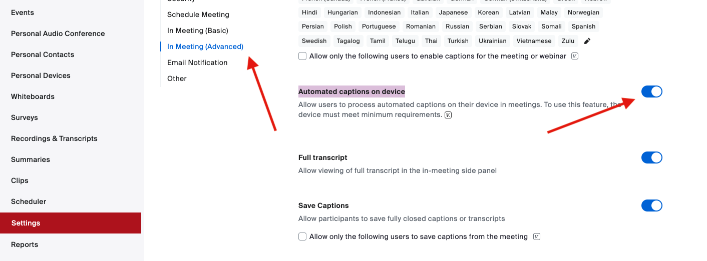 - From here, click on In Meeting (Advanced), then, ensure the Automated captions on device setting is toggled to ON, as shown below.