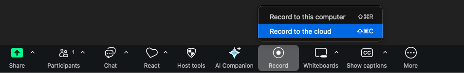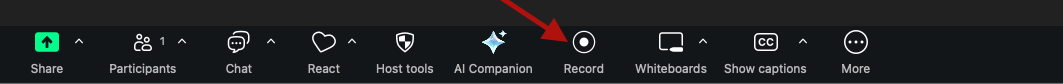 First, open a new meeting in the Zoom app (instructions on downloading this here) and click "Record":