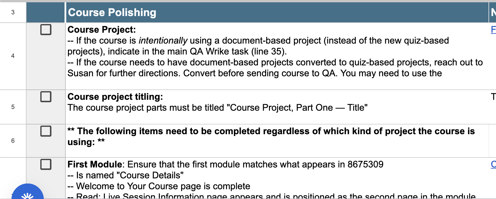 - Review/update the course specific style and settings tab in the eCornell Course Style and Settings Guide. If there isn't one, create it now and update it. (See the Creating a Course Style and Settings Guide article for directions.)
