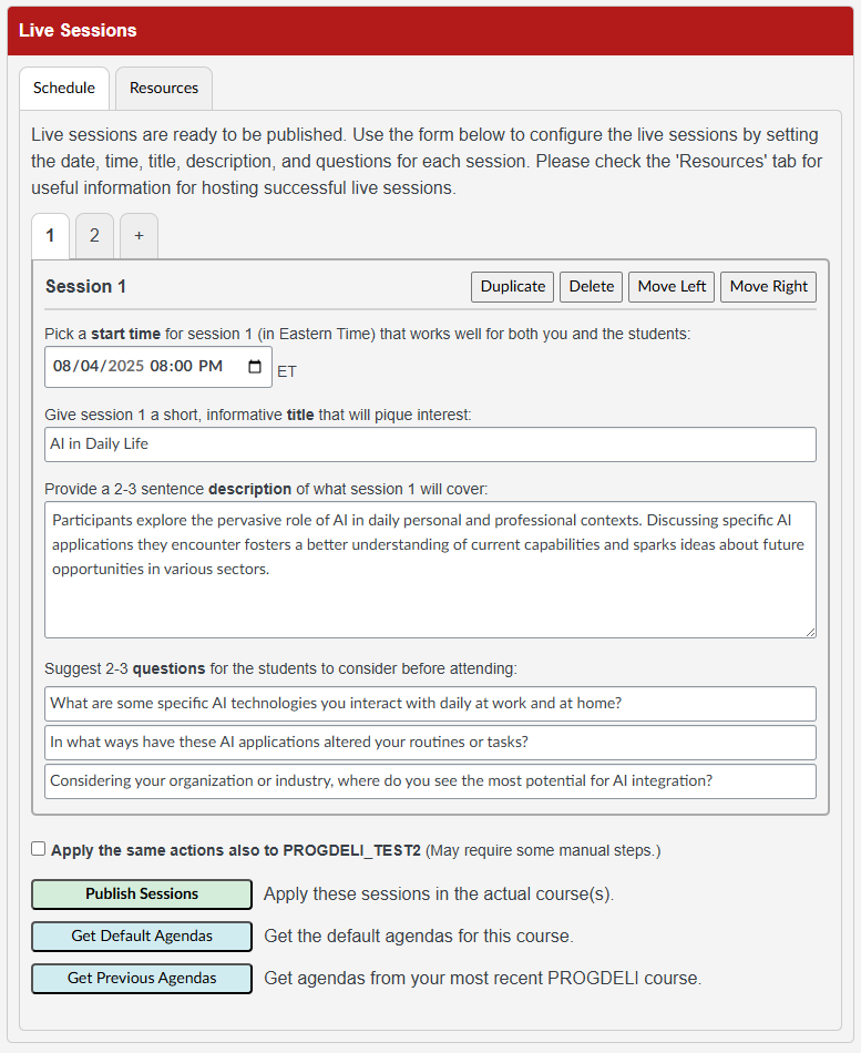 Ultimately, the course setup is the facilitator's responsibility. Even when the tool indicates that it set up the Live Sessions, it is important to verify the setup by manually checking: